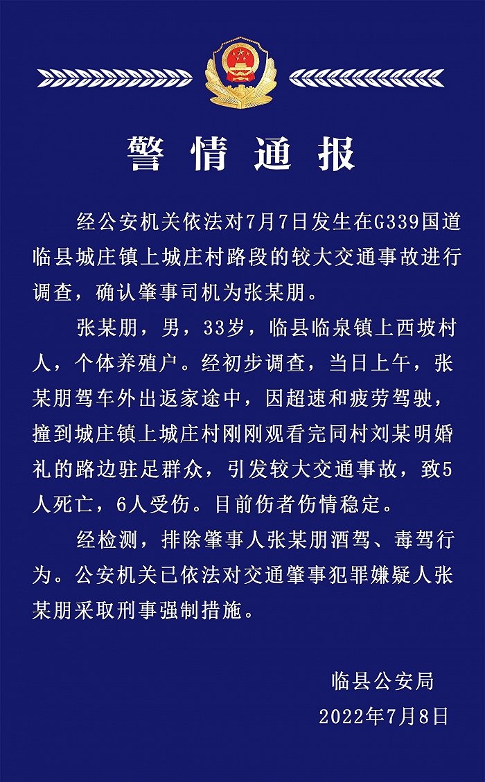 央视网消息:据“吕梁公安”微信公众号消息,临县公安局2022年7月8日发布警情通报称,经公安机关依法对7月7日发生在G339国道临县城庄镇上城庄村路段的较大交通事故进行调查,确认肇事司机为张某朋。